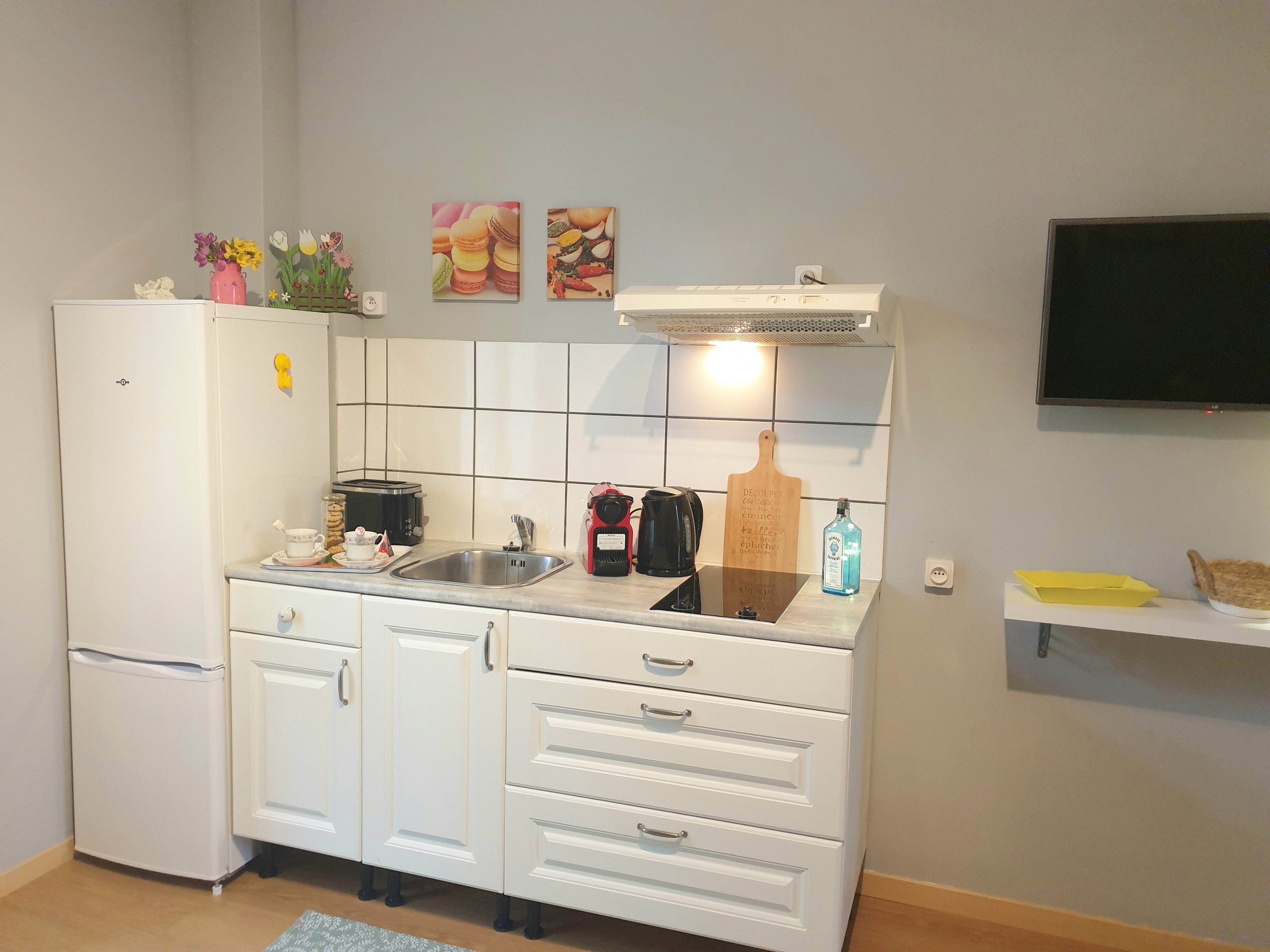 Il dispose d’un espace cuisine ouvert sur le salon, créant une pièce de vie conviviale et lumineuse. Une télévision est à votre disposition pour vos moments de détente.